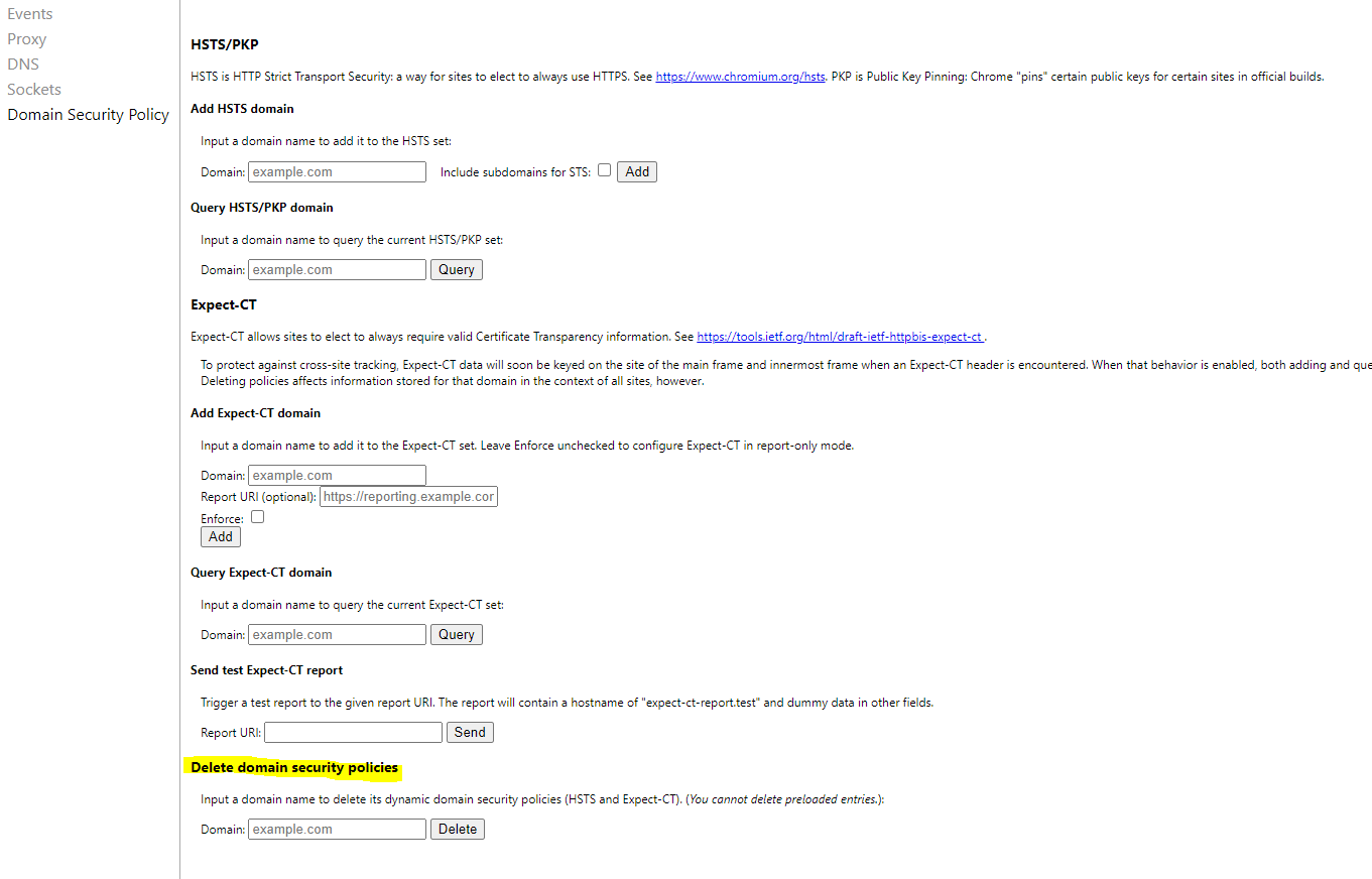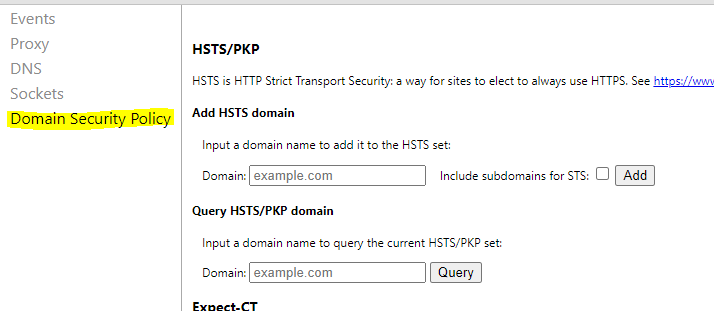 1) 주소창에 chrome://net-internals/#hsts 입력해서 크롬 설정페이지로 이동!