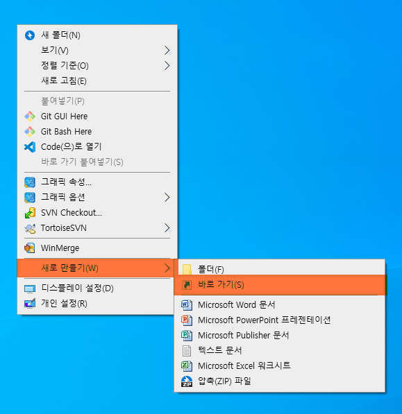 1. 바탕화면에 마우스 오른쪽 버튼을 눌러 바로가기 메뉴가 뜨면 새로 만들기 → 바로 가기(S) 메뉴를 선택 합니다.