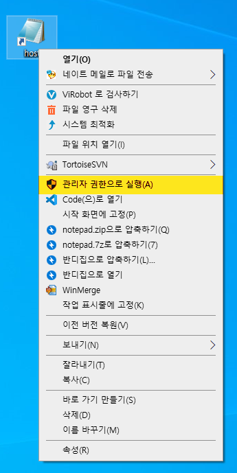 4. 바탕화면에 만들었던 host수정 메모장 파일을 마우스 오른쪽 버튼을 눌러 관리자 권한으로 실행 메뉴를 선택합니다.